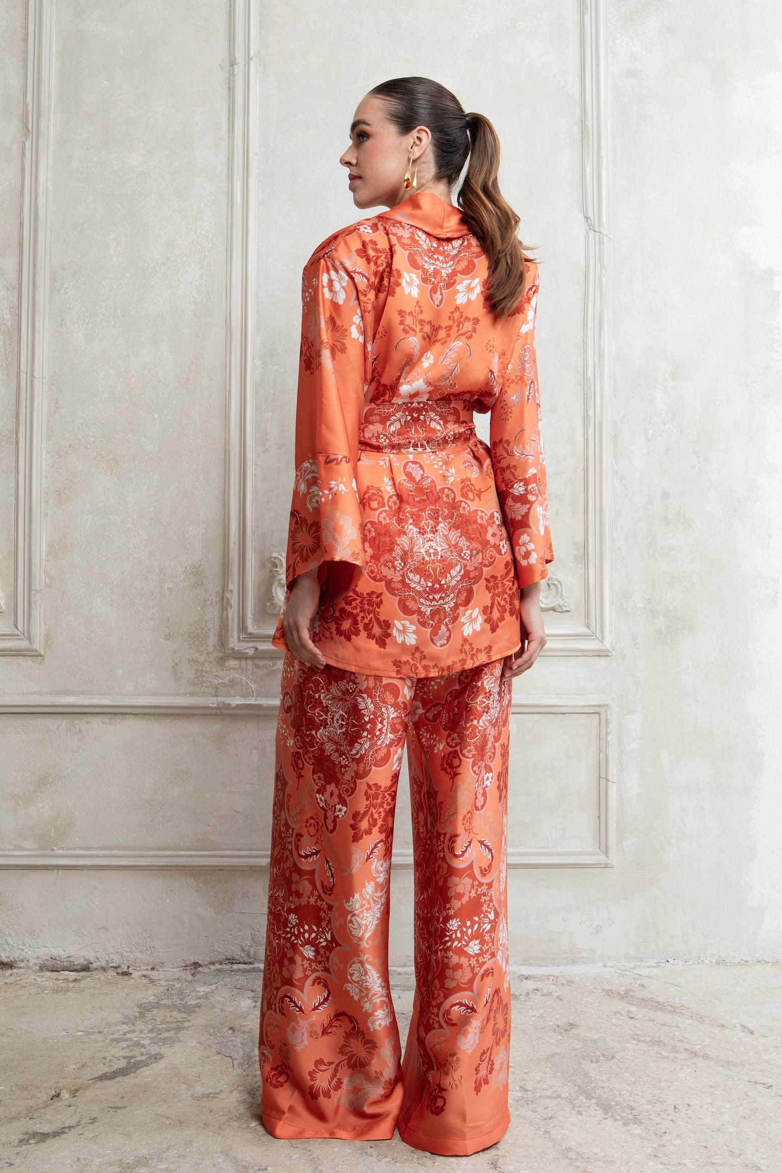 Το κιμονό-style top με ζώνη αγκαλιάζει τη σιλουέτα, ενώ το wide-leg παντελόνι χαρίζει κίνηση και αέρινη γραμμή. Ιδανικό για all-day εμφανίσεις που μεταβαίνουν effortlessly από το πρωί στο βράδυ.