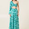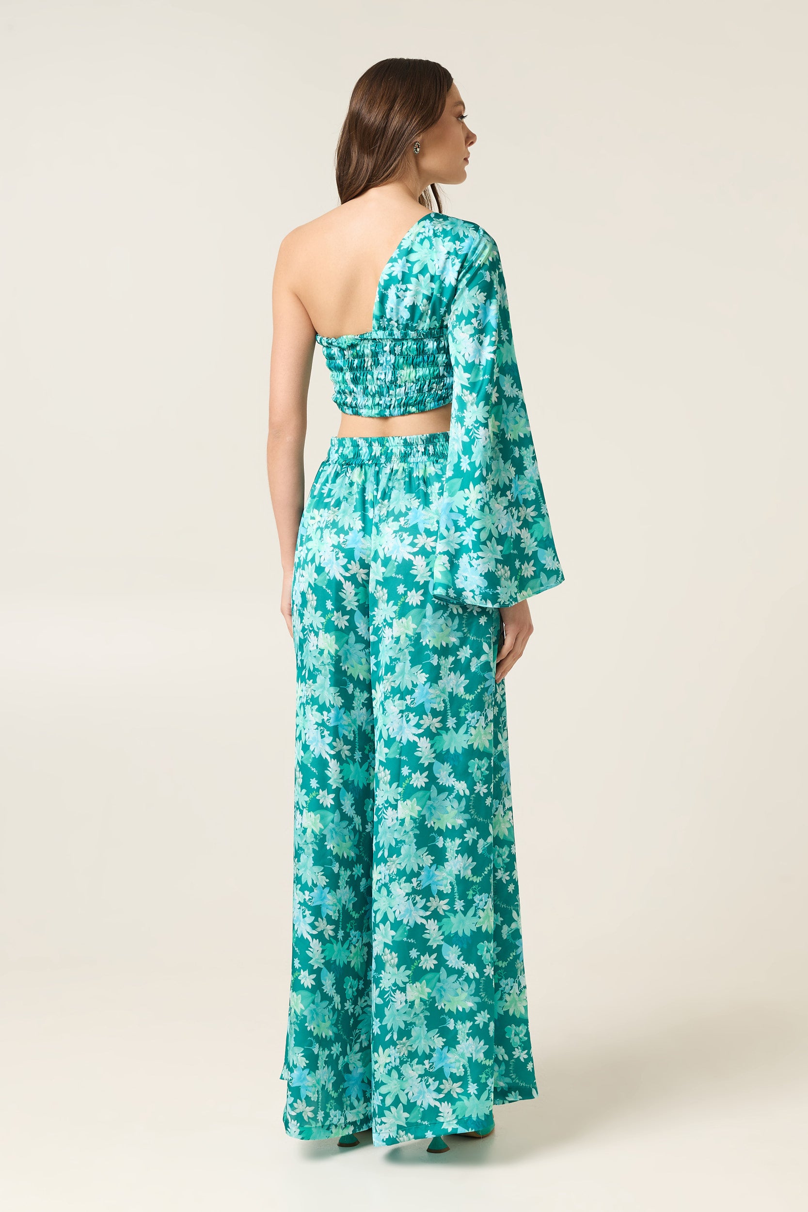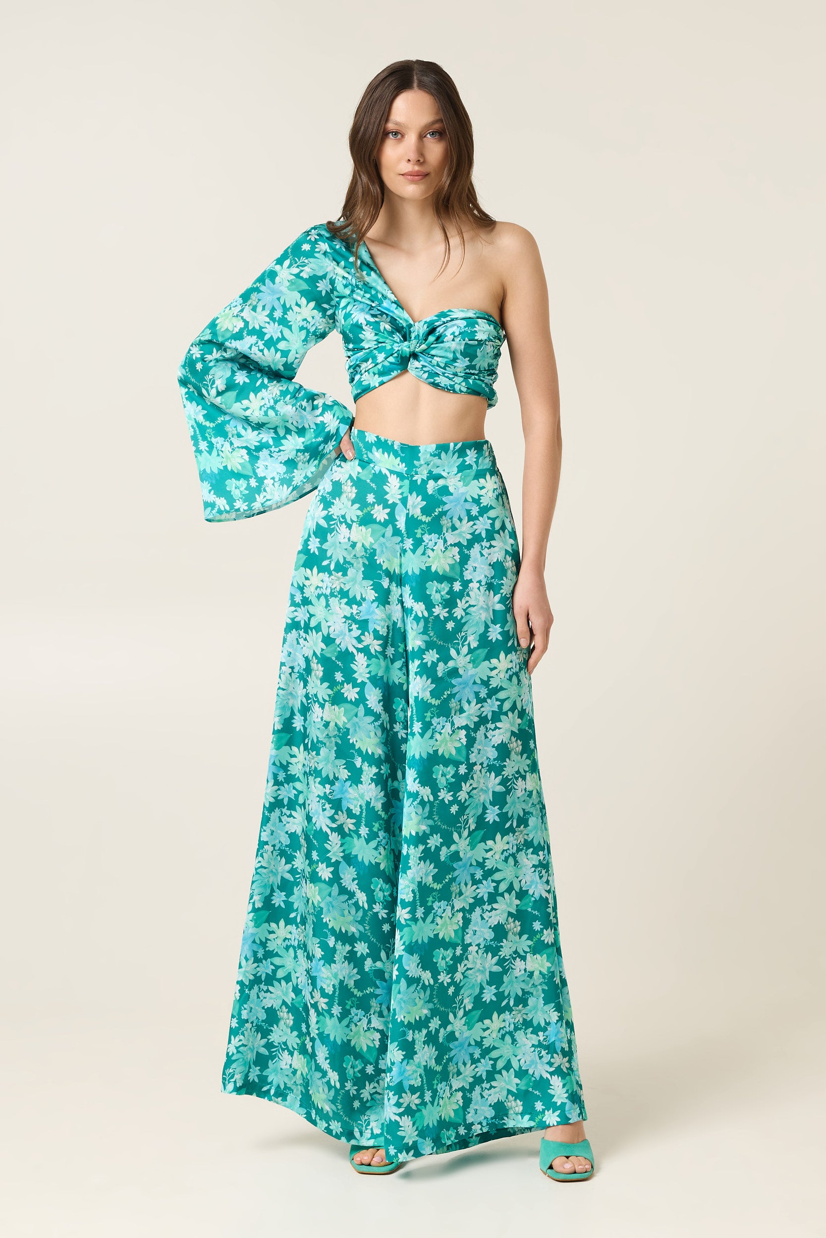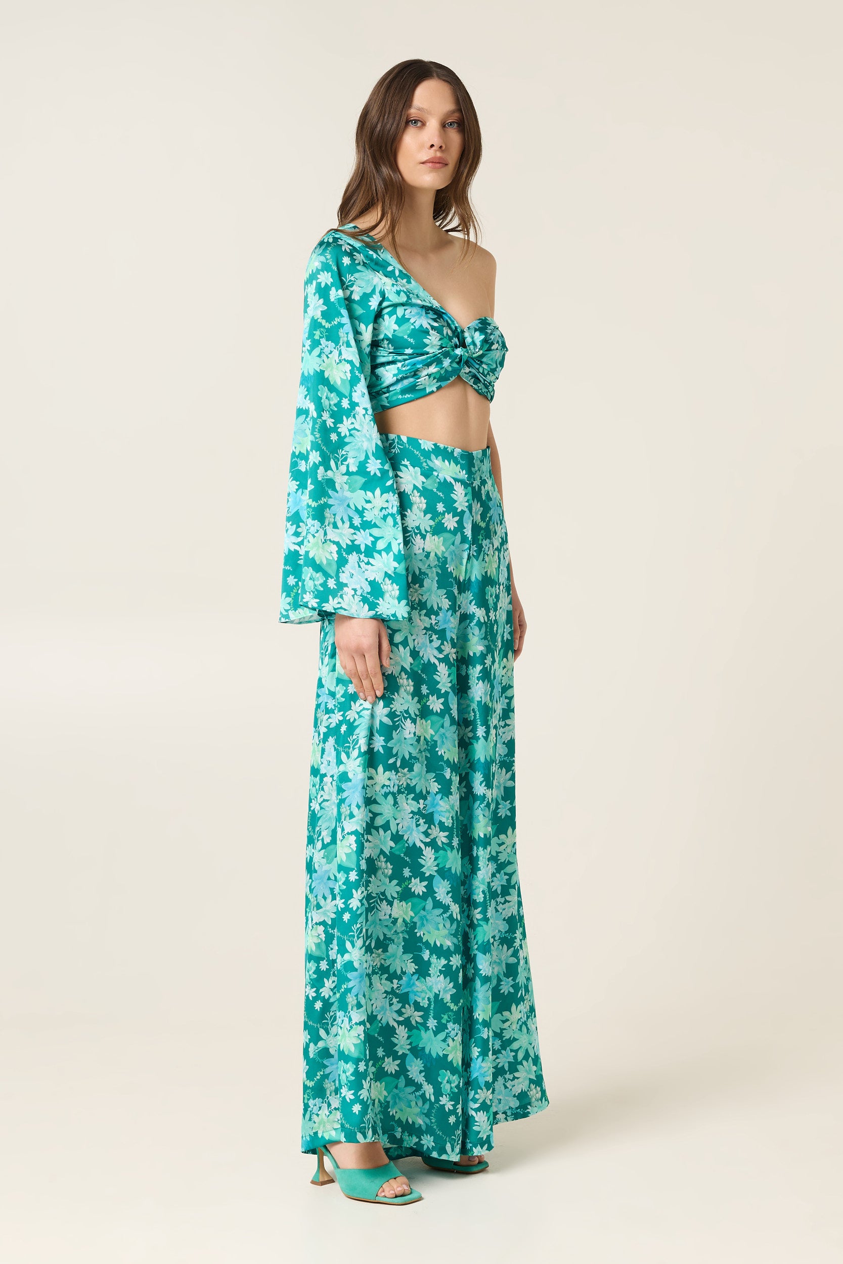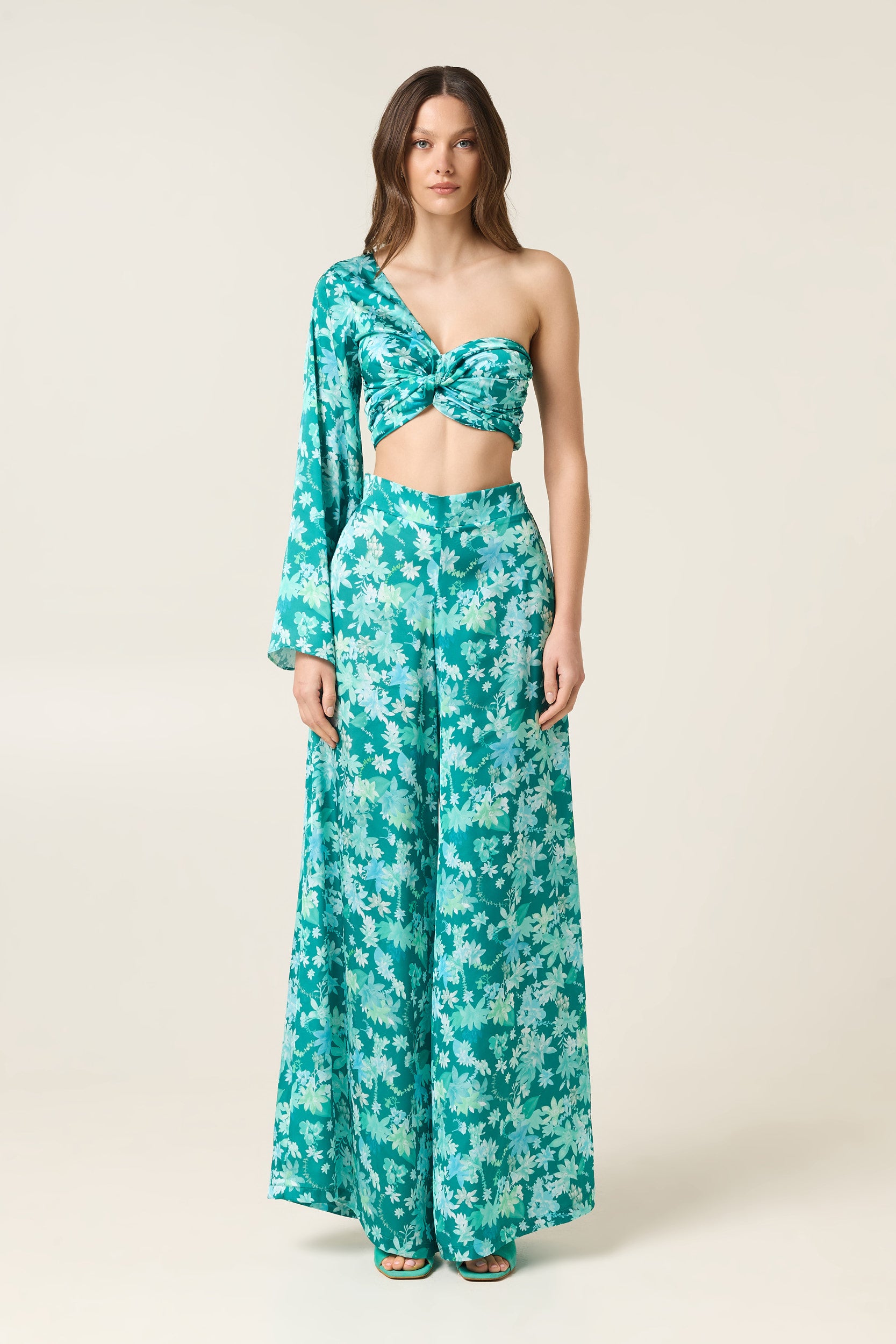 Η BOTANICAL HIGH WAISTED SATIN PANTS της EVELEYA SS26 ξεχωρίζει μέσα από το ζωντανό floral μοτίβο σε αποχρώσεις του πράσινου και του τιρκουάζ, δημιουργώντας ένα δυναμικό και φωτεινό αποτέλεσμα.