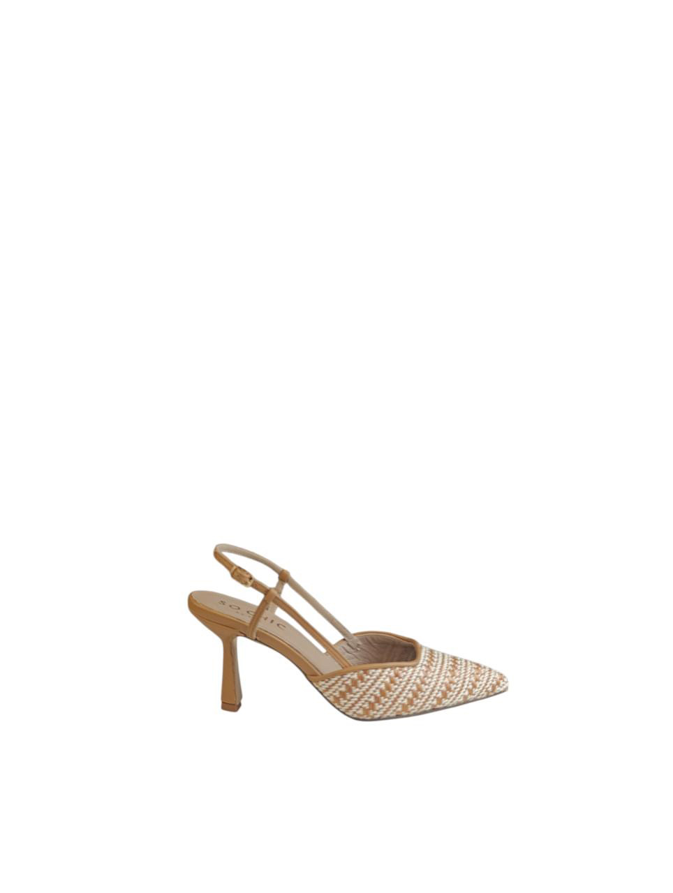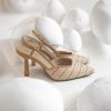 Διαθέτει λεπτά δερμάτινα λουράκια σε μπεζ χρώμα που αγκαλιάζουν το πόδι, ενώ το slingback λουράκι στη φτέρνα προσφέρει σταθερότητα και θηλυκή γραμμή. Η μυτερή μύτη επιμηκύνει οπτικά το πόδι, ενώ το καμπυλωτό τακούνι προσθέτει μοντέρνα αισθητική και άνεση στο περπάτημα.