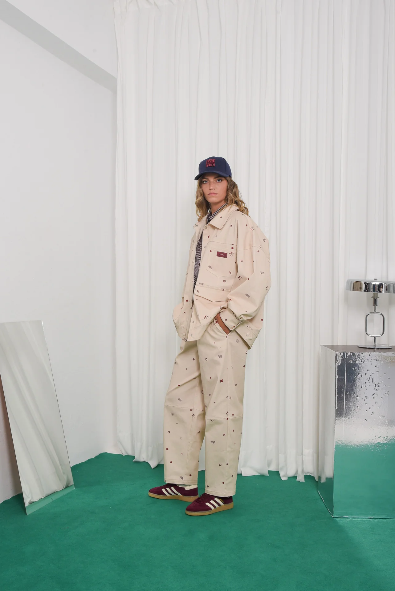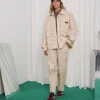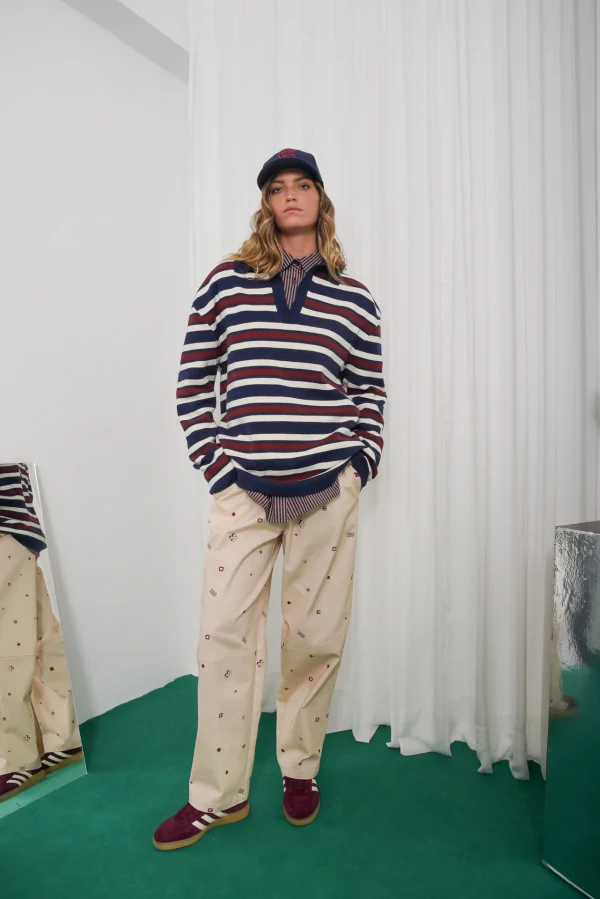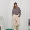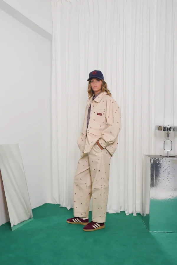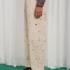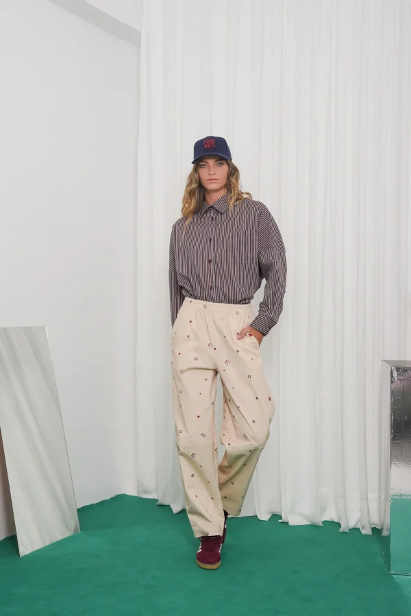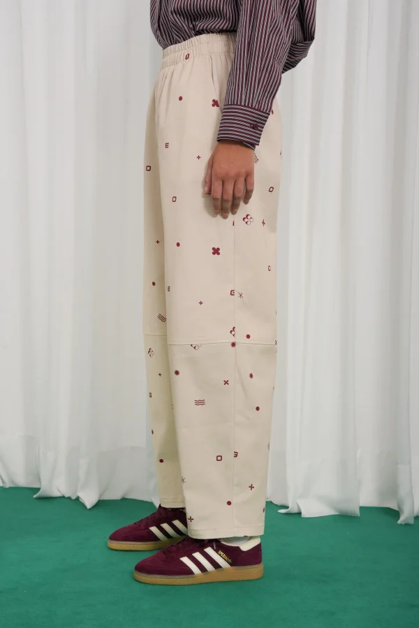 The Ego pants are made from beige cotton printed with red geometric symbols. They have a high elasticated waist, relaxed straight leg fit, side pockets, and stitched knee panels for structure.