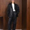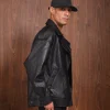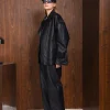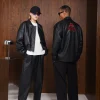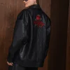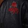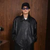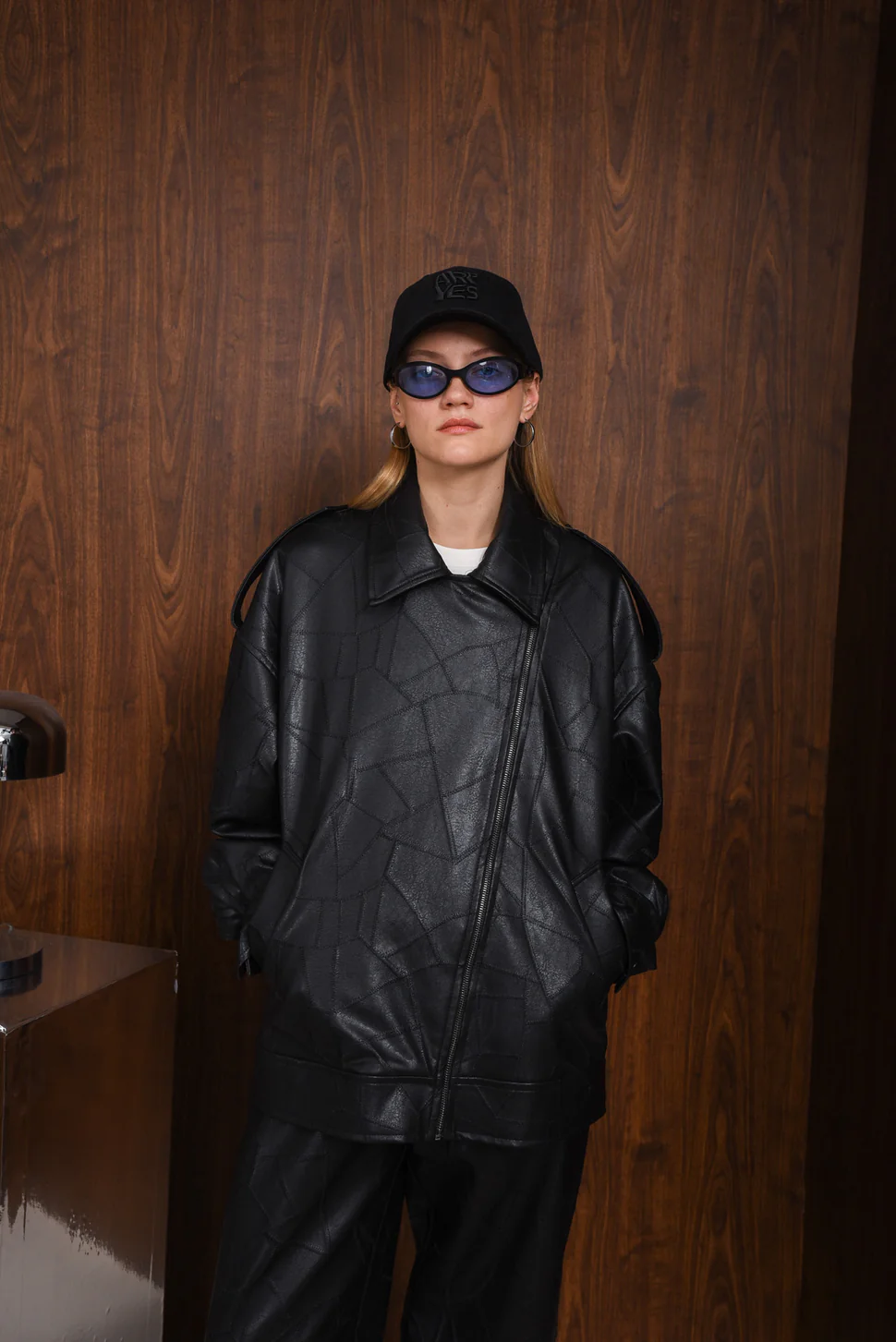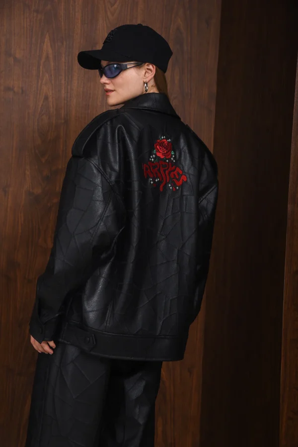 The Identity jacket is crafted from textured eco faux leather with a patchwork effect. It features a relaxed oversized fit, pointed collar, and asymmetric zip closure. Designed with shoulder straps, side pockets, and adjustable cuffs, it stands out with an embroidered red rose and logo “ARPYES” detail on the back. A bold, statement layer.
