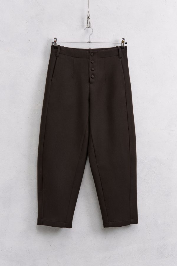 Trousers made of viscose blend. Front pleat detail. Hidden front pockets. Front button closure. Regular fit, available in size S/M/L.